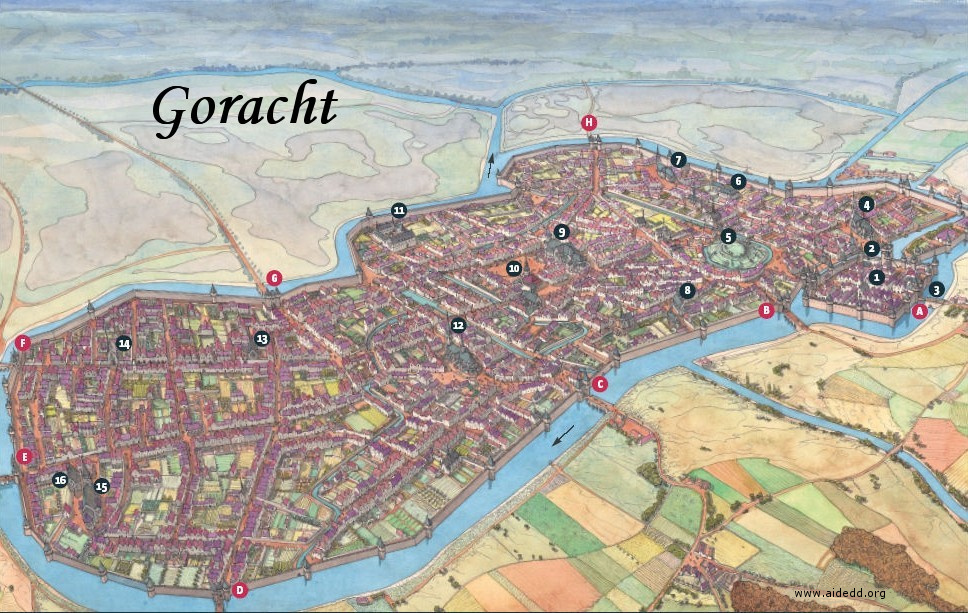 Goracht (6810 habitants) est la capitale du duché d'Agramor. La ville est entièrement fortifiée, et un canal artificiel a même été creusé tout le long des remparts pour renforcer les protections. Les alentours de Goracht sont des champs, des champs et encore des champs. Une année se cultive le côté sud, l'année suivante le côté nord, et ainsi de suite au fil des ans. L'ordre et la discipline règne dans toute la province, et plus encore dans la capitale. La milice y est omniprésente. La ville est austère, mais ni pauvre ni riche. Seul le splendide palais du duc fait de Goracht une ville particulière.