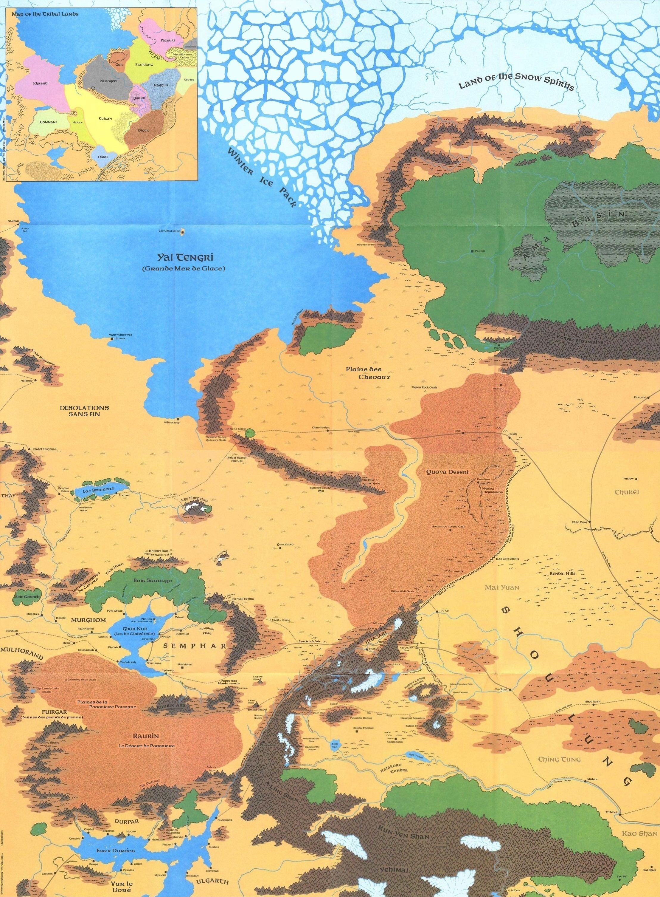 La capitale du Khazari est Skarou, une petite ville où vit le prince Ogandi, le régent du pays. Mais en réalité c'est un homme dépourvu d'influence, les villes de Khazari étant chacune dirigée par un gouverneur et les fiefs par des seigneurs. Tous ces titres se transmettent de père en fils. Une autre force du pays sont les moines de la Voie Lumineuse, un ordre extrêmement indépendant, avec lequel le prince doit également composer. Et puis il y a Shou Lung, auquel le Khazari appartenait dans le passé. L'empereur de ce grand royaume d'orient n'a d'ailleurs jamais cessé de réclamer les terres du Khazari. Toutefois l'heure n'est pas encore à l'épreuve de force pour Shou Lung, qui a réussi à placer auprès du prince de nombreux conseillers qui n'hésitent pas à influencer celui-ci lors de ses prises de décisions afin que cela favorise l'empire.